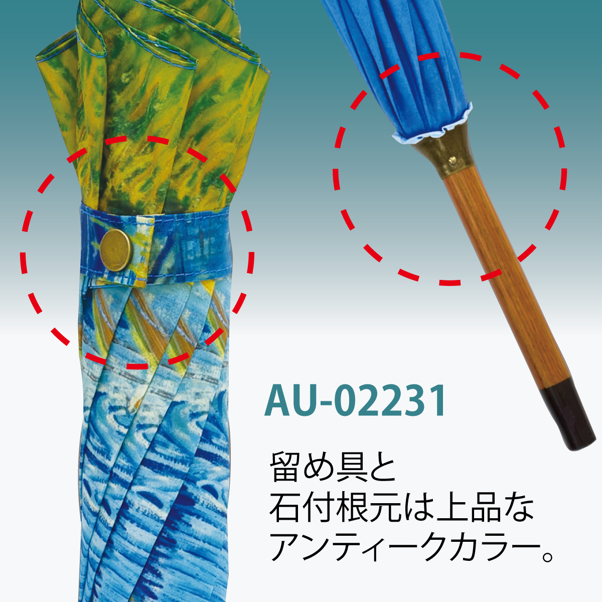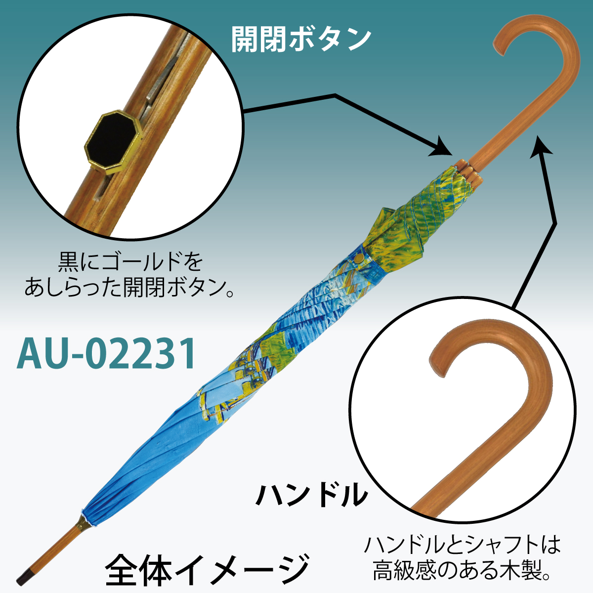 ナチュラルな雰囲気を残す木製ハンドルの名画ジャンプ傘。色鮮やかな名画が雨の日の気分を上げてくれます。