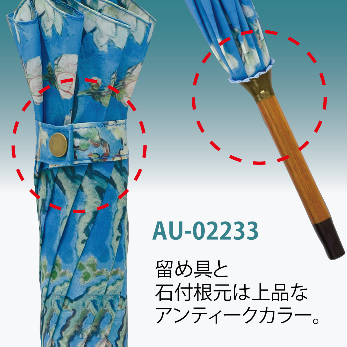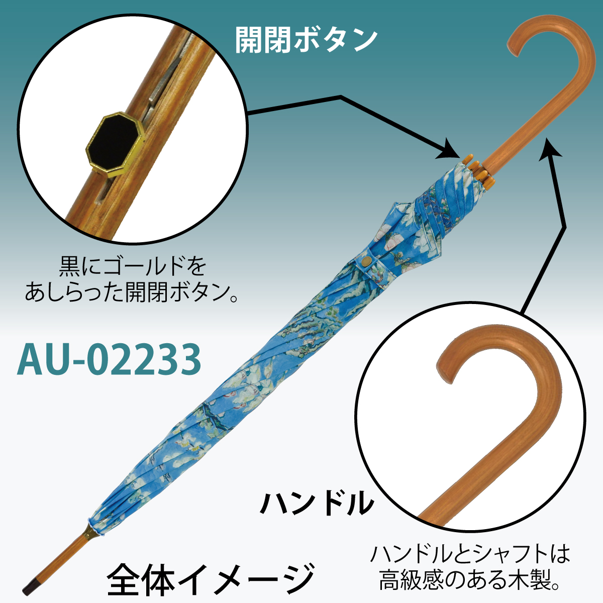 ナチュラルな雰囲気を残す木製ハンドルの名画ジャンプ傘。色鮮やかな名画が雨の日の気分を上げてくれます。