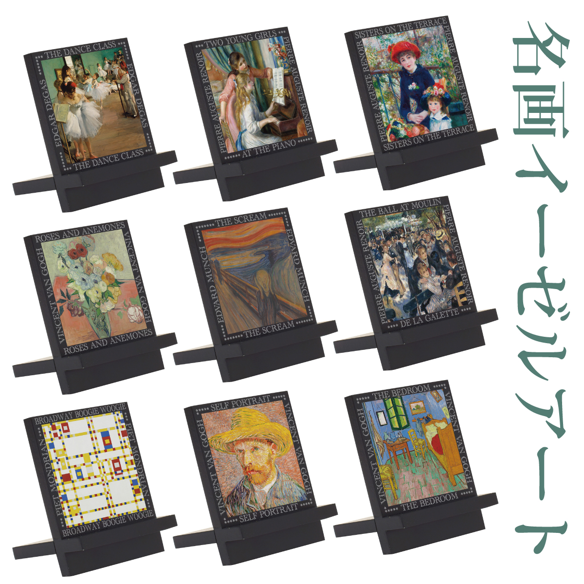 様々な名画が木製イーゼルになりました。スマホなどを置くのに便利なアートイーゼル。