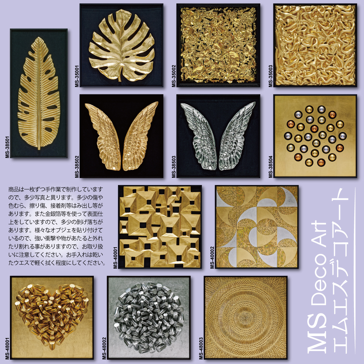 木やポリ樹脂等の様々な材料や、多くのゴールドを使い職人が一枚ずつ丁寧に作り上げた、デコラティヴなスペシャルウォールアート。